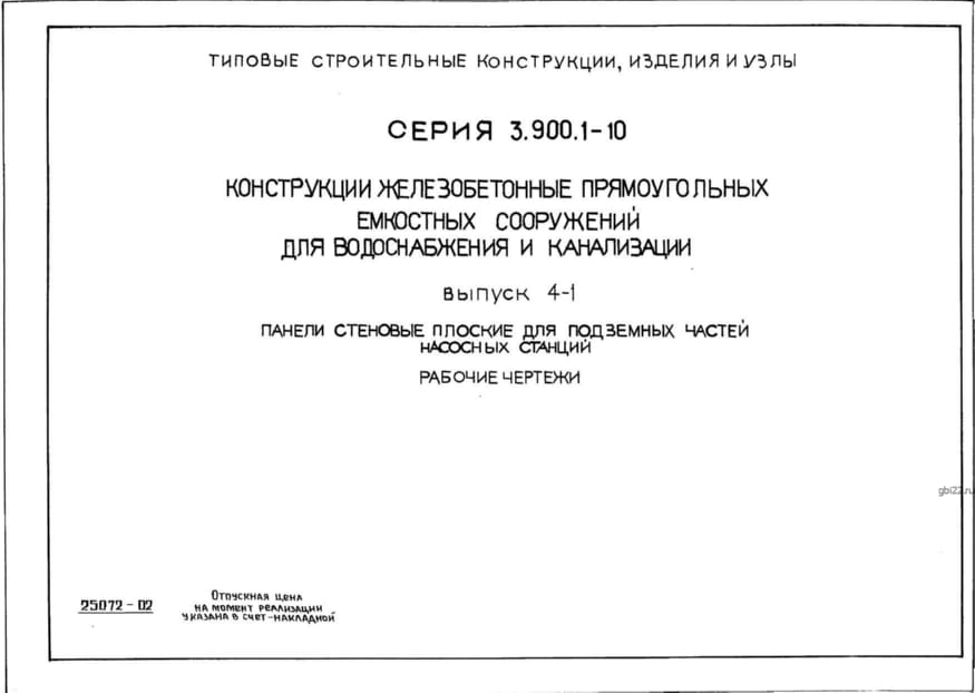 | Название стандарта | Конструкции железобетонные прямоугольные емкостных сооружений для водоснабжения и канализации. |