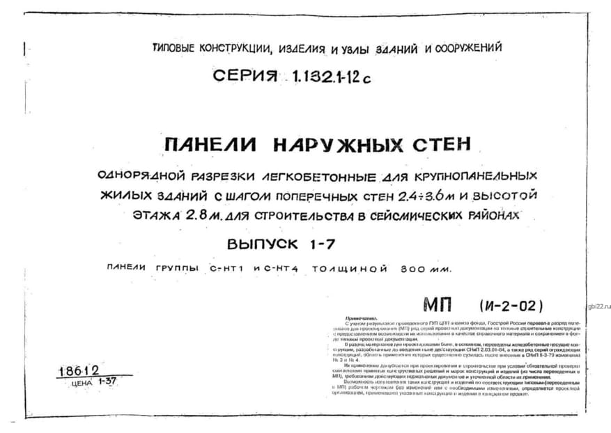 | Название стандарта | Панели наружных стен однорядной разрезки легкобетонные для крупнопанельных жилых зданий с шагом поперечных стен 2,4 - 3,6 м и высотой этажа 2,8 м для строительства в сейсмических районах. |