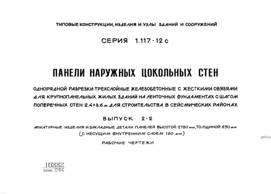 | Название стандарта | Панели наружных цокольных стен однорядной разрезки трехслойные железобетонные с жесткими связями для крупнопанельных жилых зданий на ленточных фундаментах с шагом поперечных стен 2,4 - 3,6 м для строительства в сейсмических районах. |