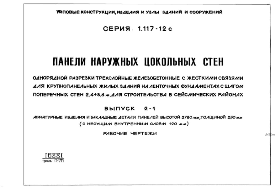 | Название стандарта | Панели наружных цокольных стен однорядной разрезки трехслойные железобетонные с жесткими связями для крупнопанельных жилых зданий на ленточных фундаментах с шагом поперечных стен 2,4 - 3,6 м для строительства в сейсмических районах. |