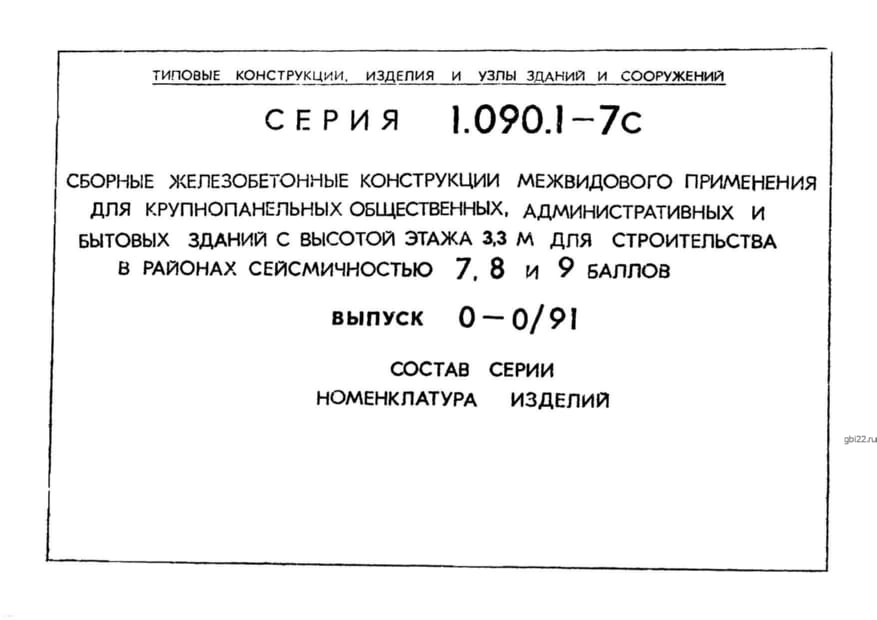 | Название стандарта | Сборные железобетонные конструкции межвидового применения для крупнопанельных общественных, административных и бытовых зданий с высотой этажа 3,3 м для строительства в районах сейсмичностью 7, 8, 9 баллов. |