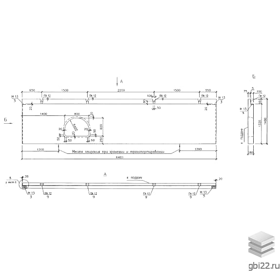 Перевозка — на панелевозах с фиксацией. Складирование — вертикально на подкладки. Погрузка — за монтажные петли с балансирующими траверсами.