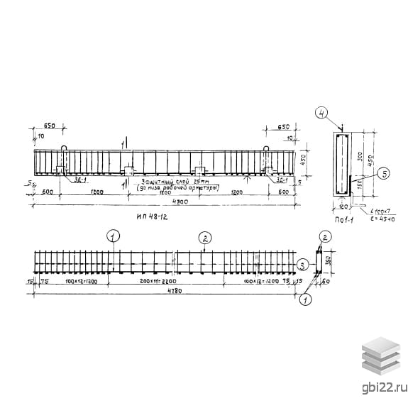 Перемычки ИП 48-12 – это железобетонные конструкции высокой прочности, обладающие продолговатой прямоугольной формой и сечением. Благодаря надежному армированию, они обеспечивают высокую несущую способность (до 1500 кг/м, включая собственный вес).