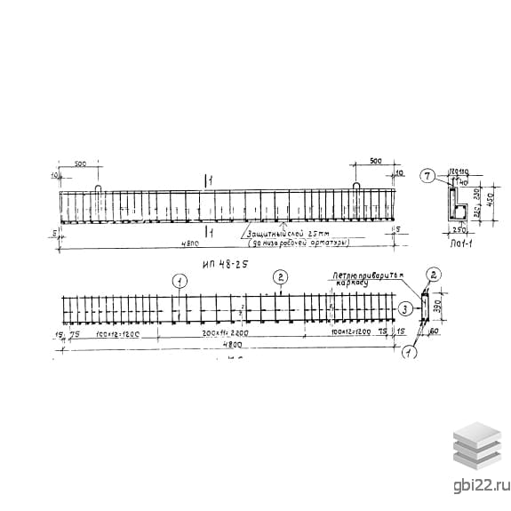 Перемычки ИП 48-25 изготавливаются из высококачественных материалов на современном оборудовании с соблюдением всех стандартов. Армирование выполняется сварными каркасами и отдельными арматурными стержнями из стали классов А-111 и А-1. Все элементы защищены антикоррозийным покрытием, а бетонирование осуществляется тяжелой смесью марки М200.