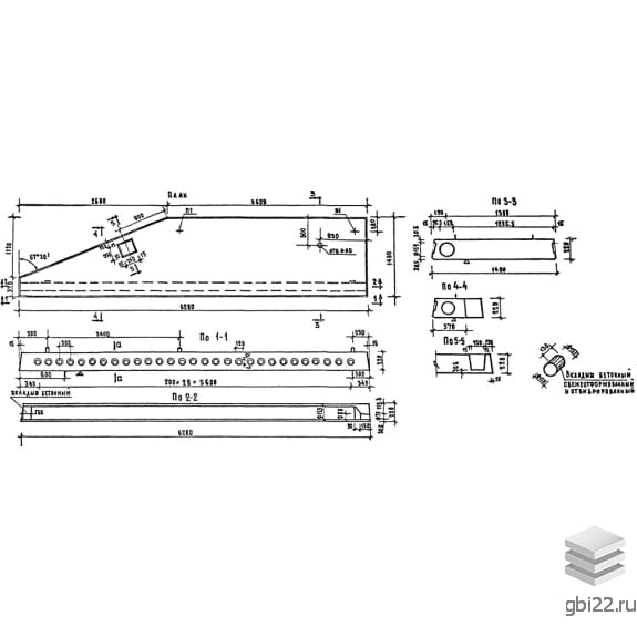 Панели перекрытия ИП 63-15 ла – это ключевые элементы межэтажных перекрытий в кирпичных жилых зданиях с продольными несущими стенами. Они представляют собой прямоугольные плиты толщиной 220 мм, оснащенные поперечными воздушными каналами. По периметру панели имеют скосы под небольшим углом, а с левой стороны предусмотрен частично срезанный торец. Для прокладки инженерных коммуникаций вдоль правой длинной грани предусмотрено горизонтальное сквозное отверстие диаметром 159 мм.