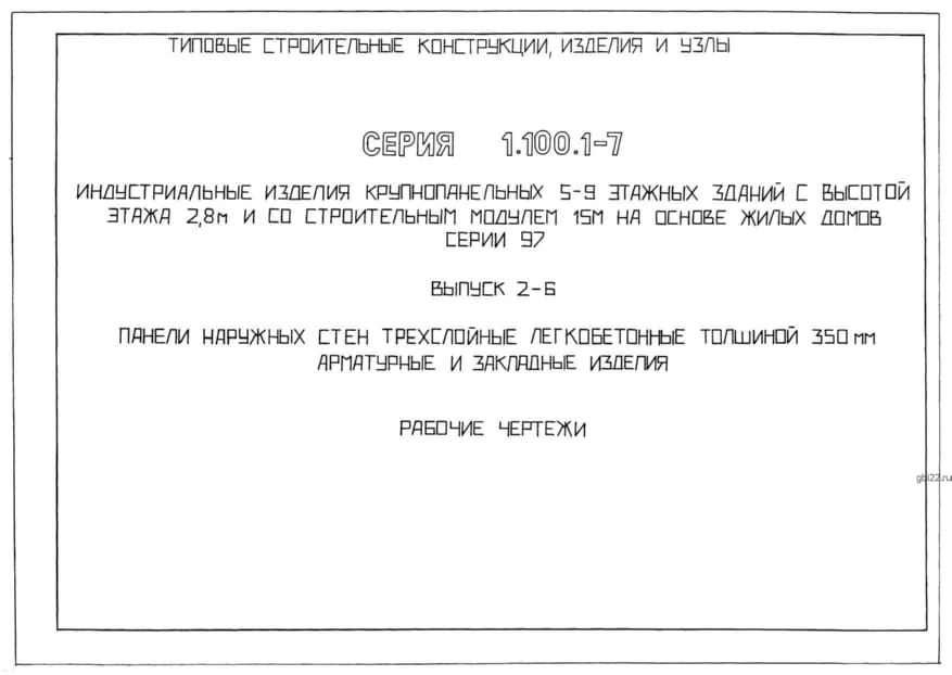 | Название стандарта | Индустриальные изделия крупнопанельных 5 – 9 этажных зданий с высотой этажа 2,8 м и со строительным модулем 15 м на основе жилых домов серии 97. Выпуск 0. Состав серии. Материалы для проектирования. |