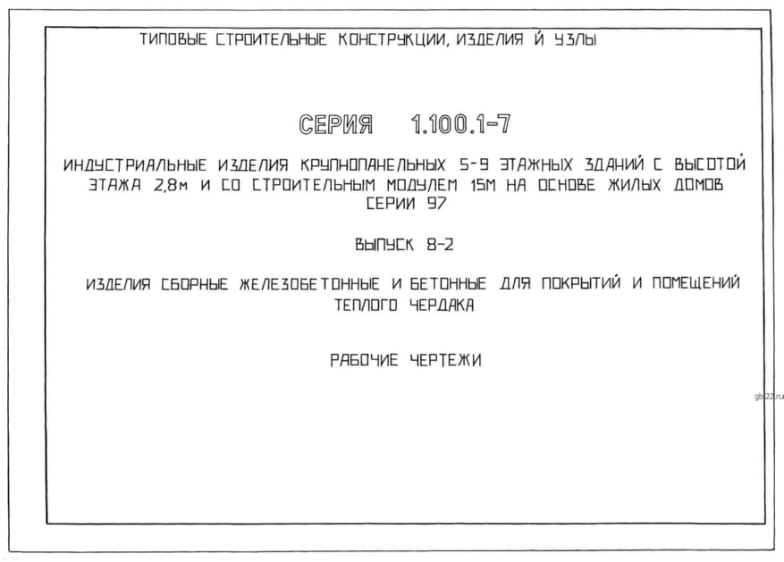 | Название стандарта | Индустриальные изделия крупнопанельных 5 – 9 этажных зданий с высотой этажа 2,8 м и со строительным модулем 15 м на основе жилых домов серии 97. Выпуск 0. Состав серии. Материалы для проектирования. |