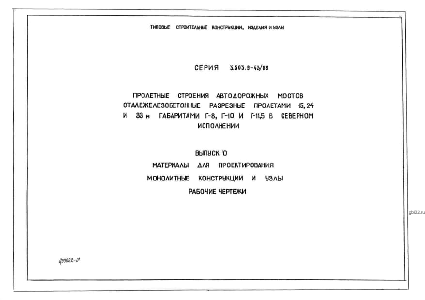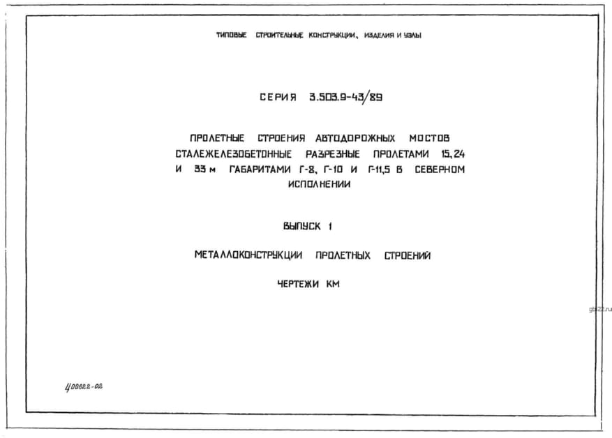 | Название стандарта | Пролетные строения автодорожных мостов сталежелезобетонные разрезные пролетами 15, 24 и 33 м габаритами Г-8, Г-10 и Г-11,5 в северном исполнении. |