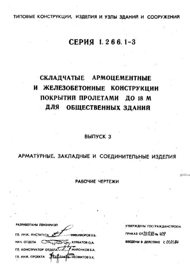 | Название стандарта | Складчатые армоцементные и железобетонные конструкции покрытий пролетами до 18 м для общественных зданий. |
