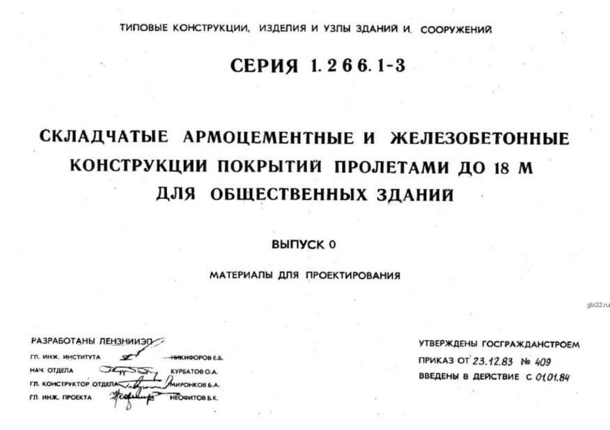 | Название стандарта | Складчатые армоцементные и железобетонные конструкции покрытий пролетами до 18 м для общественных зданий. |