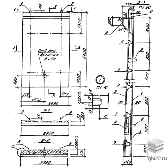 Изготавливаются из цемента (ГОСТ 10178-76) и заполнителей (ГОСТ 10268-80) с армированием по Серии 3.002.1-1. Формируются в горизонтальном положении с 4 монтажными петлями.