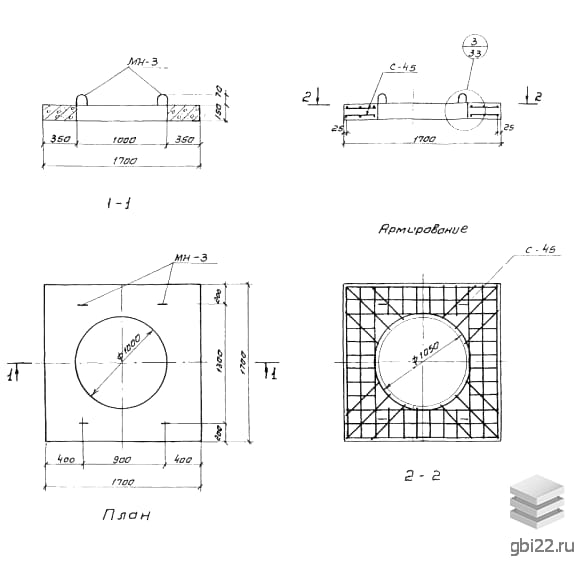 Опорная плита ПО 10 представляет собой плоское квадратное изделие, выполненное из тяжелого бетона и металла, с круглым сквозным отверстием в центре, предназначенным для установки полимерно-песчаного или чугунного люка. Это изделие является важным элементом сборного железобетонного колодца, который устанавливается на проезжей части городских и областных автомагистралей. Такие колодцы используются для организации подземных трубопроводов канализационных, водопроводных и газопроводных систем.