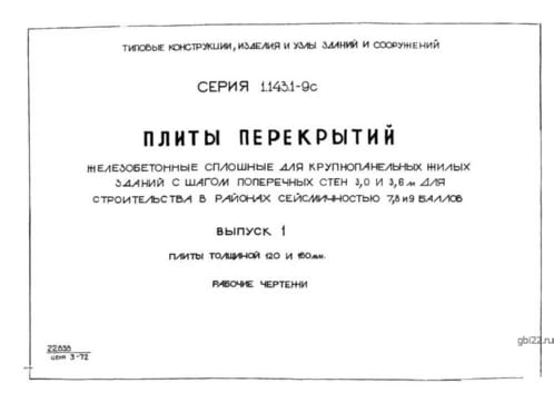 | Название стандарта | Плиты перекрытий железобетонные сплошные для крупнопанельных жилых зданий с шагом поперечных стен 3,0 и 3,6 м для строительства в районах сейсмичностью 7, 8 и 9 баллов. |