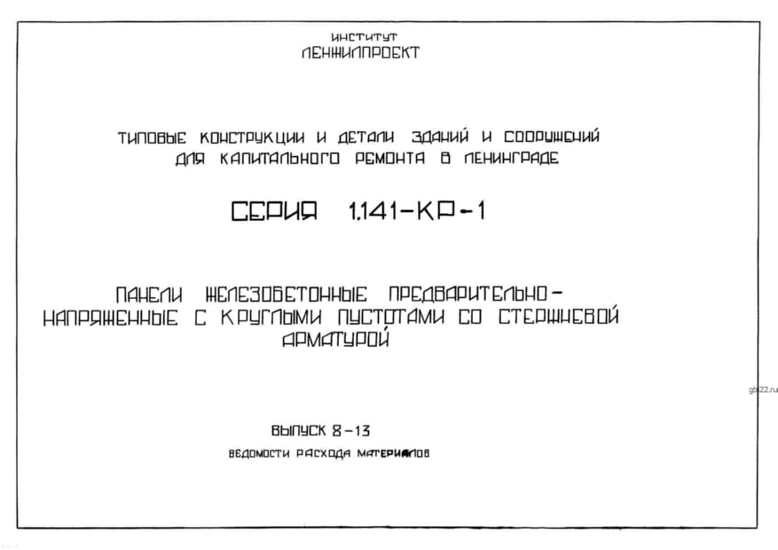 | Название стандарта | Панели железобетонные предварительно-напряженные с круглыми пустотами со стержневой арматурой. С выпускными ребрами под расчетную нагрузку 900 кг/кв. м. |