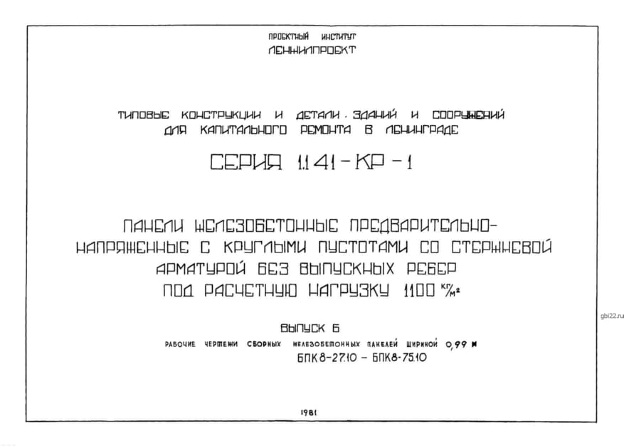 | Название стандарта | Панели железобетонные предварительно-напряженные с круглыми пустотами со стержневой арматурой. С выпускными ребрами под расчетную нагрузку 900 кг/кв. м. |