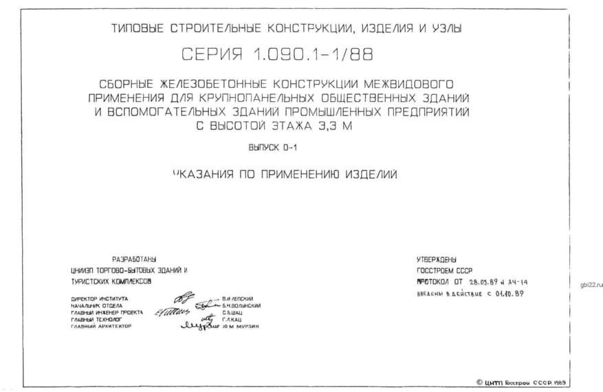 | Название стандарта | Сборные железобетонные конструкции межвидового применения для крупнопанельных общественных зданий и вспомогательных зданий промышленных предприятий с высотой этажа 3,3 м. |