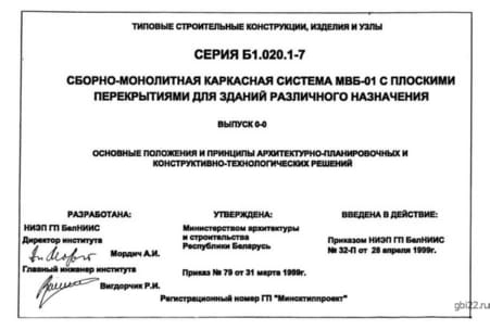 | Название стандарта | Сборно-монолитная каркасная система МВБ-01 с плоскими перекрытиями для зданий различного назначения. |