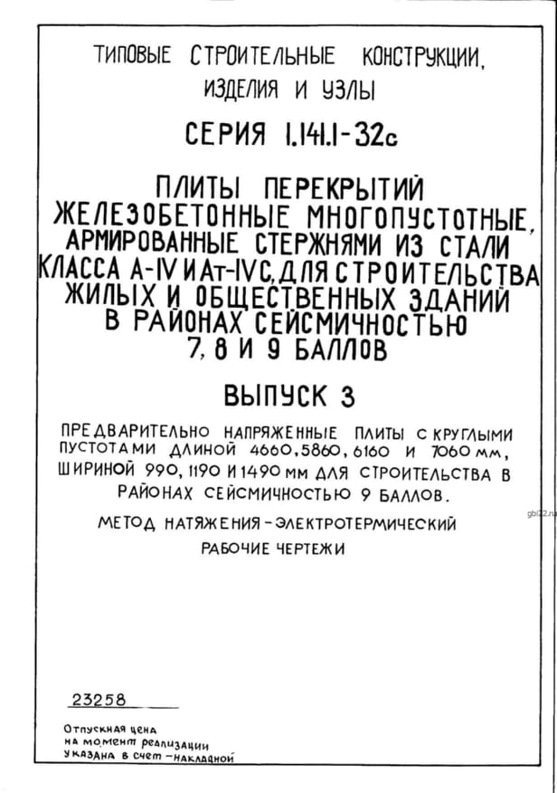 | Название стандарта | Плиты перекрытий железобетонные многопустотные, армированные стержнями из стали класса А-IV и Ат-IVC, для строительства жилых и общественных зданий в районах сейсмичностью 7, 8, 9 баллов. |