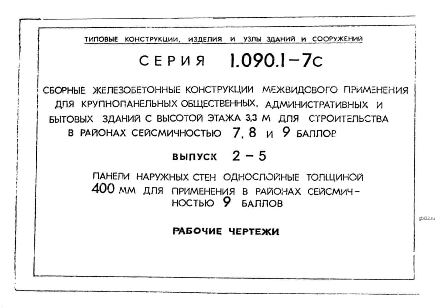 | Название стандарта | Сборные железобетонные конструкции межвидового применения для крупнопанельных общественных, административных и бытовых зданий с высотой этажа 3,3 м для строительства в районах сейсмичностью 7, 8, 9 баллов. |