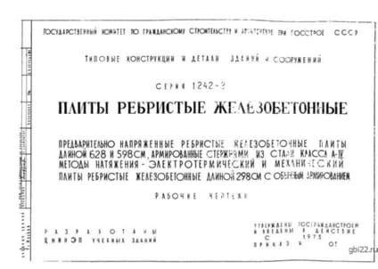 | Название стандарта | Предварительно напряженные ребристые железобетонные плиты длиной 628 и 598 см, армированные стержнями из стали класса А-IV. Метод натяжения - электротермический и механический. Плиты ребристые железобетонные длиной 298 см с объемным армированием. Рабочие |