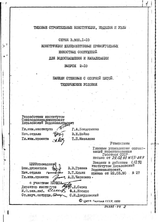 | Название стандарта | Конструкции железобетонные прямоугольные емкостных сооружений для водоснабжения и канализации. |