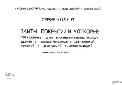 | Название стандарта | Плиты покрытий и лотковые трехслойные для крупнопанельных жилых зданий с теплым чердаком и безрулонной кровлей с мастичной гидроизоляцией. Рабочие чертежи. |