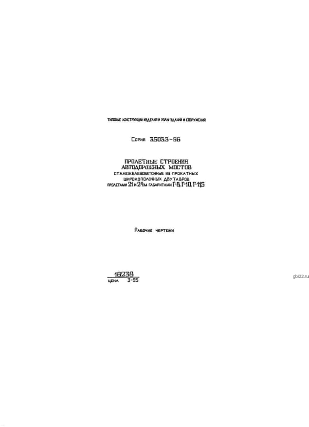 | Название стандарта | Пролетные строения автодорожных мостов сталежелезобетонные из прокатных широкополочных двутавров пролетами 21 и 24 м габаритами Г-8, Г-10 и Г-11,5. Рабочие чертежи. |
