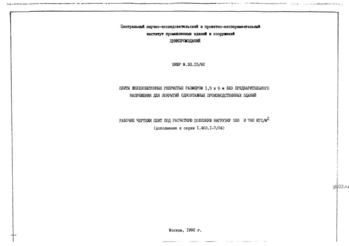 | Название стандарта | Плиты железобетонные ребристые размером 1,5х6 м без предварительного напряжения для покрытий одноэтажных производственных зданий. Рабочие чертежи плит под расчетную полезную нагрузку 530 и 780 кгс/кв. м (дополнение к серии 1.465.1-7/84). |