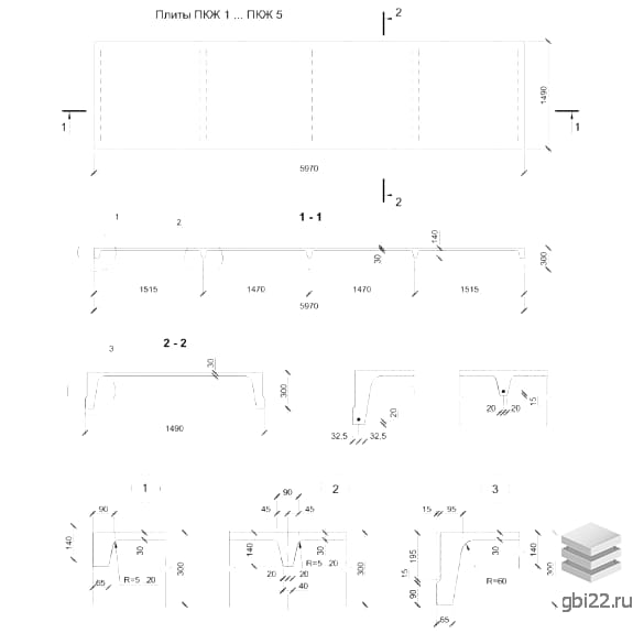 Ребристая плита ПКЖ 2 (по стандарту ГОСТ 7740-55) представляет собой высокопрочную железобетонную конструкцию П-образной формы. На поверхности плиты расположены поперечные и продольные ребра жесткости, которые позволяют изделию выдерживать значительные нагрузки. Поля между ребрами образуют плоскую армированную полку.