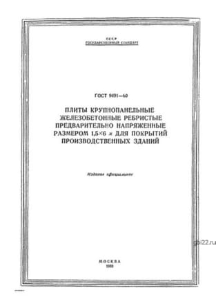 | Название стандарта | Плиты крупнопанельные железобетонные ребристые предварительно напряженные размером 1,5х6 м для покрытий производственных зданий. |