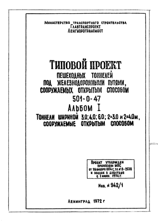 | Название стандарта | Типовой проект пешеходных тоннелей под железнодорожными путями, сооружаемых открытым способом. |