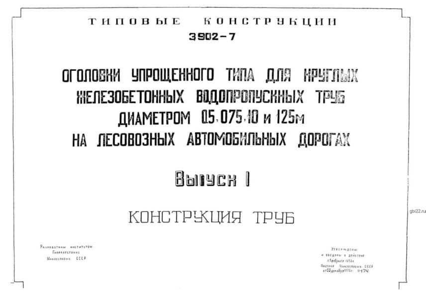 | Название стандарта | Оголовки упрощенного типа для круглых железобетонных водопропускных труб диаметром 0,5; 0,75; 1,0 и 1,25 м на лесовозных автомобильных дорогах. |