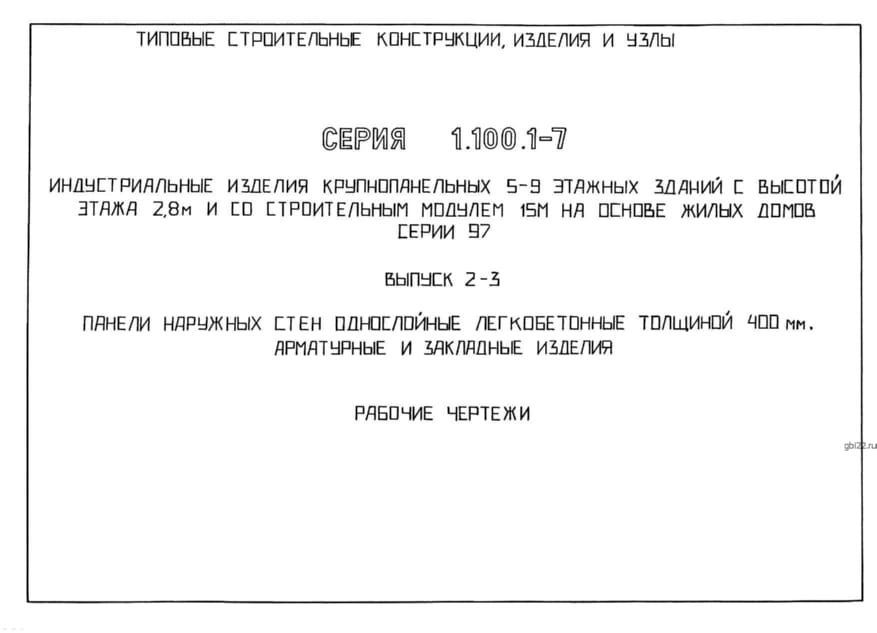 | Название стандарта | Индустриальные изделия крупнопанельных 5 – 9 этажных зданий с высотой этажа 2,8 м и со строительным модулем 15 м на основе жилых домов серии 97. Выпуск 0. Состав серии. Материалы для проектирования. |