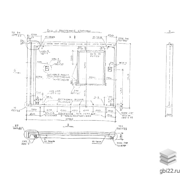 Прямоугольные панели с технологическими отверстиями под оконные и дверные блоки. На верхней грани расположены монтажные выступы для соединения с каркасом здания.