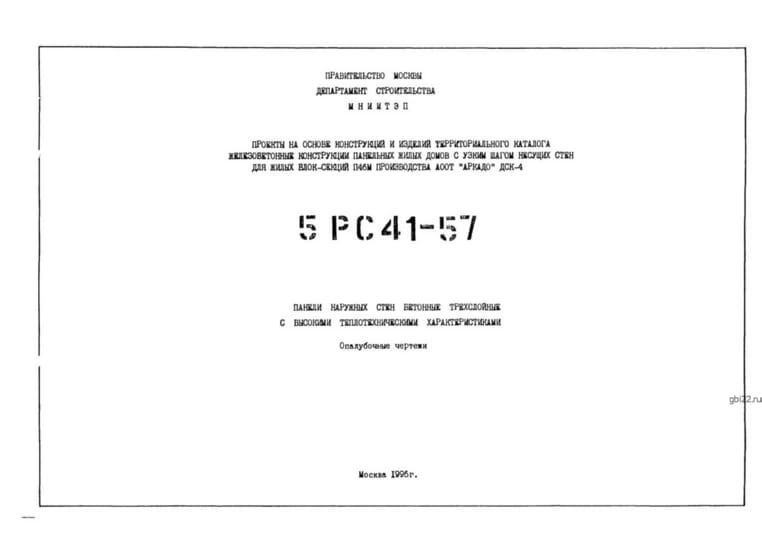 | Название стандарта | Проекты на основе конструкций и изделий территориального каталога. Железобетонные конструкции панельных жилых домов с узким шагом несущих стен для жилых блок-секций П46М производства АООТ "АРКАДО" ДСК-4. Панели наружных стен бетонные трехслойные с высоким |