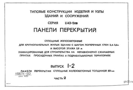 | Название стандарта | Панели перекрытий сплошные железобетонные для крупнопанельных жилых зданий с шагом поперечных стен 2,4 - 3,6 м и высотой этажа 2,8 м. Унифицированные для строительства на неравномерно сжимаемых грунтах, просадочных грунтах и подрабатываемых территориях. |