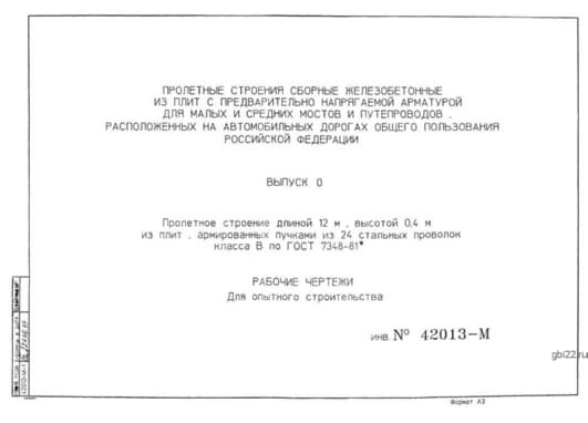 | Название стандарта | Пролетные строения сборные железобетонные из плит с предварительно напрягаемой арматурой для малых и средних мостов и путепроводов расположенных на автомобильных дорогах общего пользования Российской Федерации. |