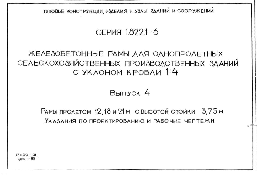 | Название стандарта | Железобетонные рамы для однопролетных сельскохозяйственных производственных зданий с уклоном кровли 1:4. |