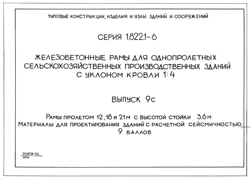 | Название стандарта | Железобетонные рамы для однопролетных сельскохозяйственных производственных зданий с уклоном кровли 1:4. |