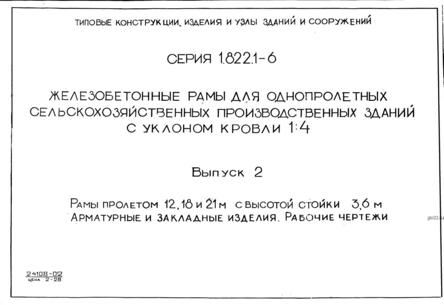 | Название стандарта | Железобетонные рамы для однопролетных сельскохозяйственных производственных зданий с уклоном кровли 1:4. |