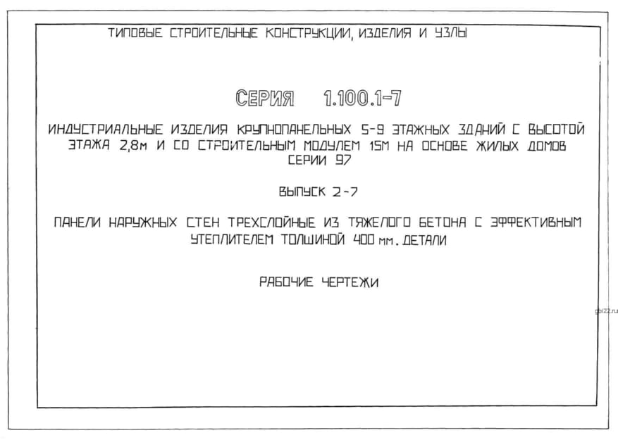 | Название стандарта | Индустриальные изделия крупнопанельных 5 – 9 этажных зданий с высотой этажа 2,8 м и со строительным модулем 15 м на основе жилых домов серии 97. Выпуск 0. Состав серии. Материалы для проектирования. |