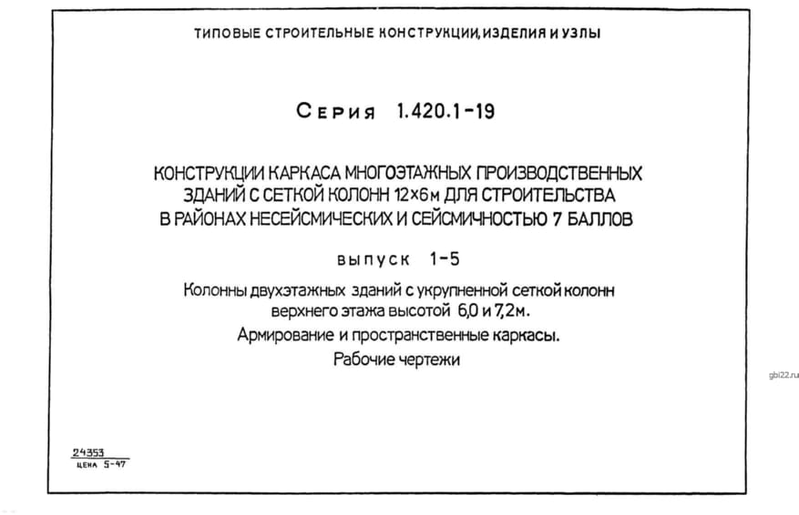 | Название стандарта | Конструкции каркаса многоэтажных производственных зданий с сеткой колонн 12х6 м для строительства в районах несейсмических и сейсмичностью 7 баллов. |