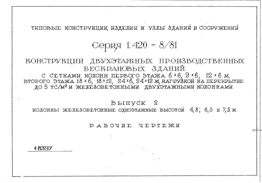 | Название стандарта | Конструкции двухэтажных производственных бескрановых зданий с сетками колонн первого этажа 6х6, 9х6, 12х6 м, второго этажа 18х6, 18х12, 24х6, 24х12 м, нагрузкой на перекрытие до 5 тс/м2 и железобетонными двухэтажными колоннами. |