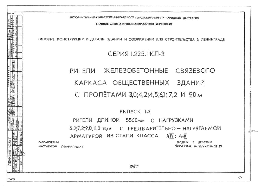 | Название стандарта | Ригели железобетонные связевого каркаса общественных зданий с пролетами 3,0; 4,2; 4,5; 6,0; 7,2 и 9,0 м. |