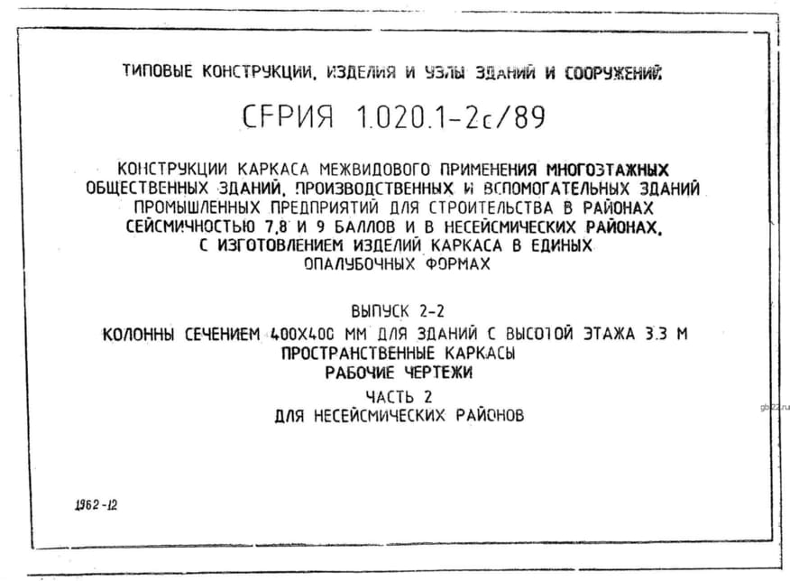 | Название стандарта | Конструкции каркаса межвидового применения многоэтажных общественных зданий, производственных и вспомогательных зданий промышленных предприятий для строительства в районах сейсмичностью 7, 8, 9 баллов и в несейсмических районах с изготовлением изделий кар |