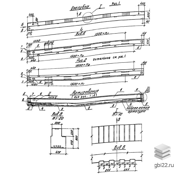 2 – отсутствие подрезок (1 – подрезки для опоры на колонны).