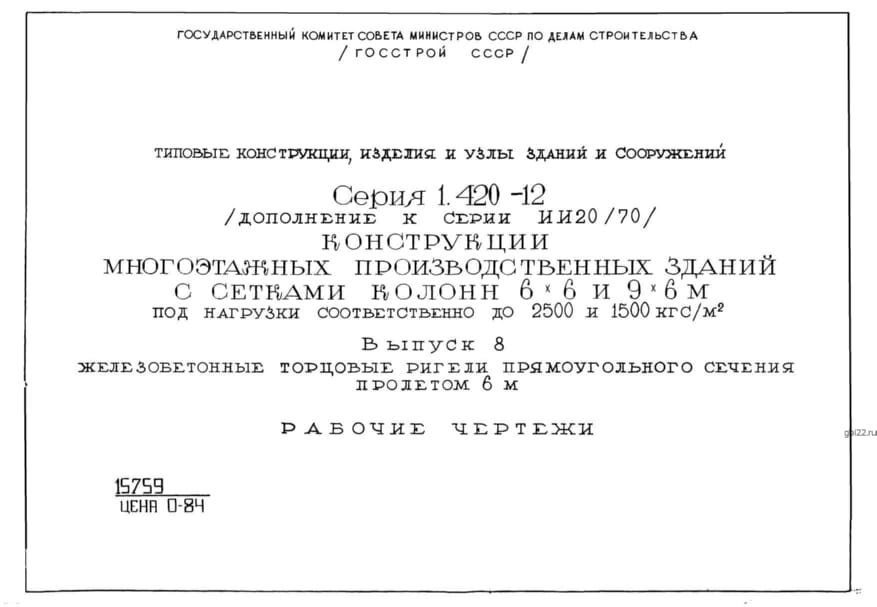 | Название стандарта | Конструкции многоэтажных производственных зданий с сетками колонн 6х6 и 9х6 м под нагрузки соответственно до 2500 и 1500 кгс/кв. м. |