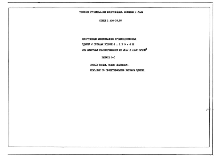 | Название стандарта | Конструкции многоэтажных производственных зданий с сетками колонн 6х6 и 9х6 м под нагрузки соответственно до 2500 и 1500 кгс/м2. |