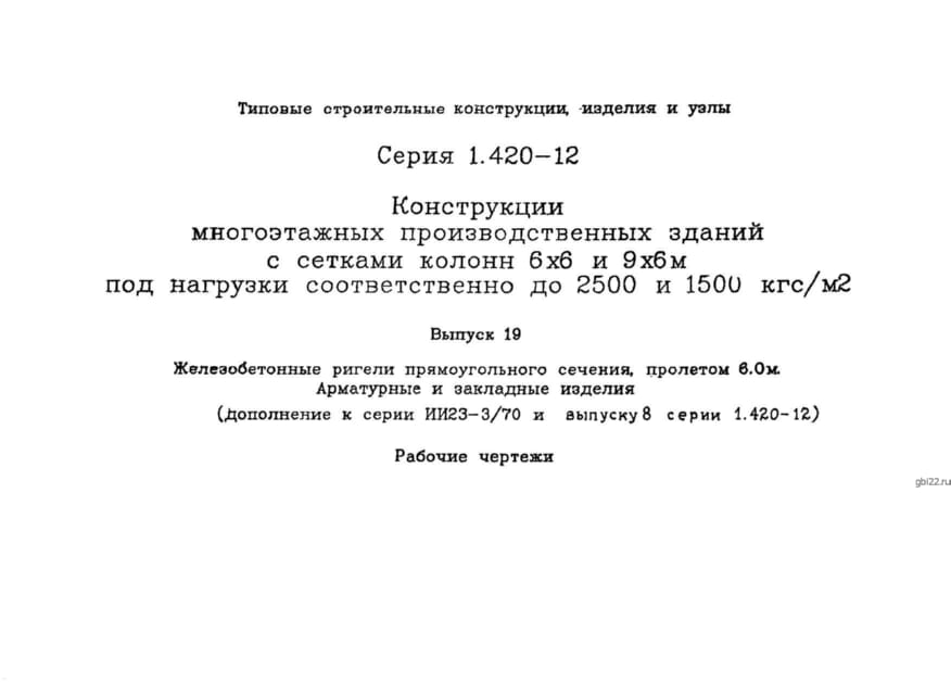 | Название стандарта | Конструкции многоэтажных производственных зданий с сетками колонн 6х6 и 9х6 м под нагрузки соответственно до 2500 и 1500 кгс/кв. м. |
