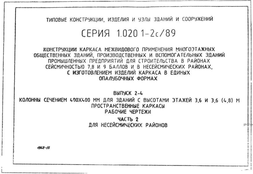 | Название стандарта | Конструкции каркаса межвидового применения многоэтажных общественных зданий, производственных и вспомогательных зданий промышленных предприятий для строительства в районах сейсмичностью 7, 8, 9 баллов и в несейсмических районах с изготовлением изделий кар |
